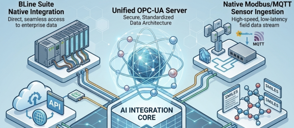 BLine Suite Integration: Functions as the AI intelligence layer across BLine Pharma Suite and BLine Automation Suite—automating workflows, batch control, LIMS queries, plant automation, and security integration with full RBAC compliance.